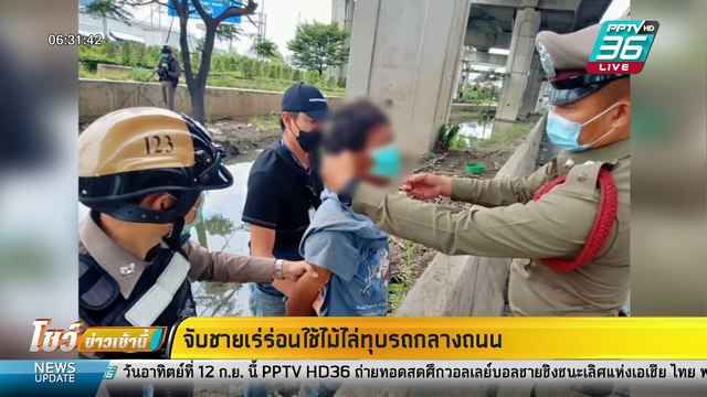 เจ้าหน้าที่ตำรวจตามจับหนุ่มเร่ร่อนใช้ไม้วิ่งทุบรถยนต์ บนถนนบางนาตราด ทำรถเสียหายกว่า 10 คัน